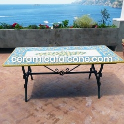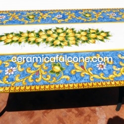 Il tavolo rettangolare Ravello decorato con limoni di varie misure in pietra lavica ceramizzata, frutto di meticolosa lavorazione artigianale, costituisce un manufatto di elevata qualità, caratterizzato da eccezionale durabilità e notevole resistenza agli agenti atmosferici.