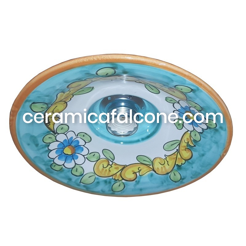 Questo lampadario piatto in ceramica vietrese è un'autentica espressione dell'artigianato locale. Interamente fatto a mano e decorato con fiori da maestri ceramisti, ogni pezzo è unico e porta con sé il vibrante spirito artistico di Vietri sul Mare. La sua forma piatta e le decorazioni vivaci, tipiche della tradizione vietrese, lo rendono un elemento distintivo capace di infondere un tocco di colore e originalità a qualsiasi ambiente, diffondendo una luce calda e accogliente.