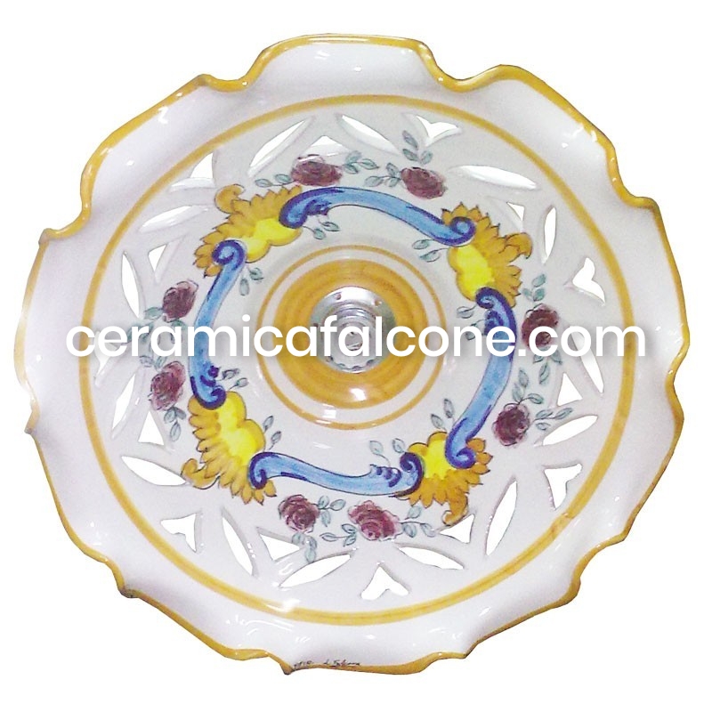 Questo lampadario piatto in ceramica vietrese è un'autentica espressione dell'artigianato locale. Interamente fatto a mano e decorato con elementi in giallo da maestri ceramisti, ogni pezzo è unico e porta con sé il vibrante spirito artistico di Vietri sul Mare. La sua forma piatta e le decorazioni vivaci, tipiche della tradizione vietrese, lo rendono un elemento distintivo capace di infondere un tocco di colore e originalità a qualsiasi ambiente, diffondendo una luce calda e accogliente.
