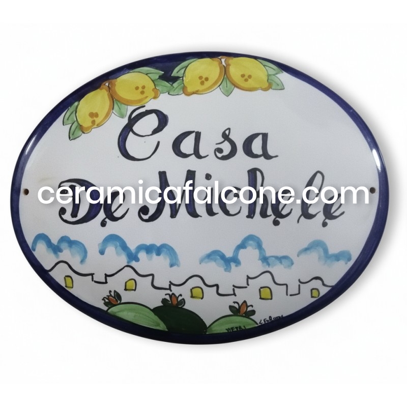 Questo Targa in ceramica ovale personalizzabile è un'autentica espressione dell'artigianato locale. Interamente fatta e decorata a mano che ricorda i limoni della costiera amalfitana, da maestri ceramisti, ogni pezzo è unico e porta con sé il vibrante spirito artistico di Vietri sul Mare. La sua forma e le decorazioni vivaci, tipiche della tradizione vietrese, lo rendono un elemento distintivo capace di infondere un tocco di colore e originalità a qualsiasi ambiente.