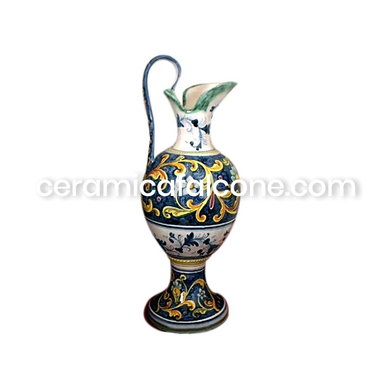 L'anfora Agostina si presenta con il suo elegante manico, di colore turchese con decorazioni barocche dalle sfumature giallo e rosso legati a fiori bianchi e boccioli.